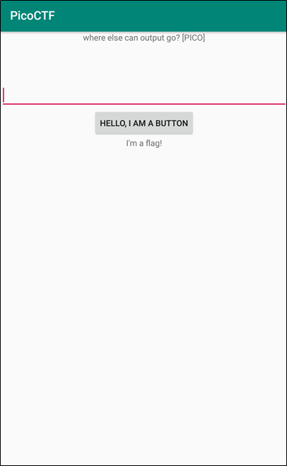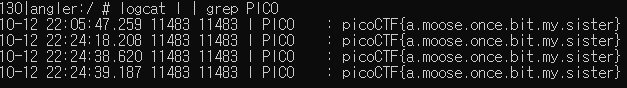 logcat을 돌려 놓고 어플에서 버튼만 클릭해주면 picoCTF{a.moose.once.bit.my.sister}값이 출력된다.