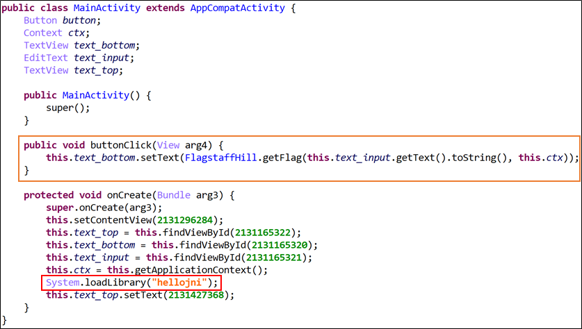 droids0 - MainActivity JEB로 어플의 MainActivity를 보면, 주황박스에서는 버튼을 눌렀을 때의 처리를 하고 빨간박스에서는 hellojni.so를 로드하는 모습을 볼 수 있다.
