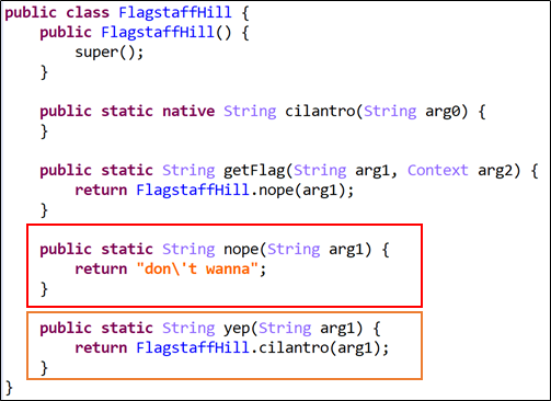 droids3 - FlagstaffHill.getFlag( ) 우리가 입력한 값은 getFlag( )의 첫 번째 인자로 넘어가는데, 입력된 값에 상관없이 nope( )가 실행된다.