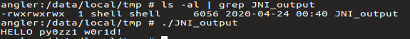 [그림 9] Binary Execute [그림 9]에서 /data/local/tmp에 push된 것을 확인할 수 있고, 바이너리도 정상적으로 실행된다.