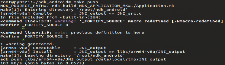 [그림 8] make push - Binary Build+ADB push make push를 입력하면 위와 같이 바이너리가 빌드되고 adb push로 빌드된 바이너리가 /data/local/tmp로 복사된다.