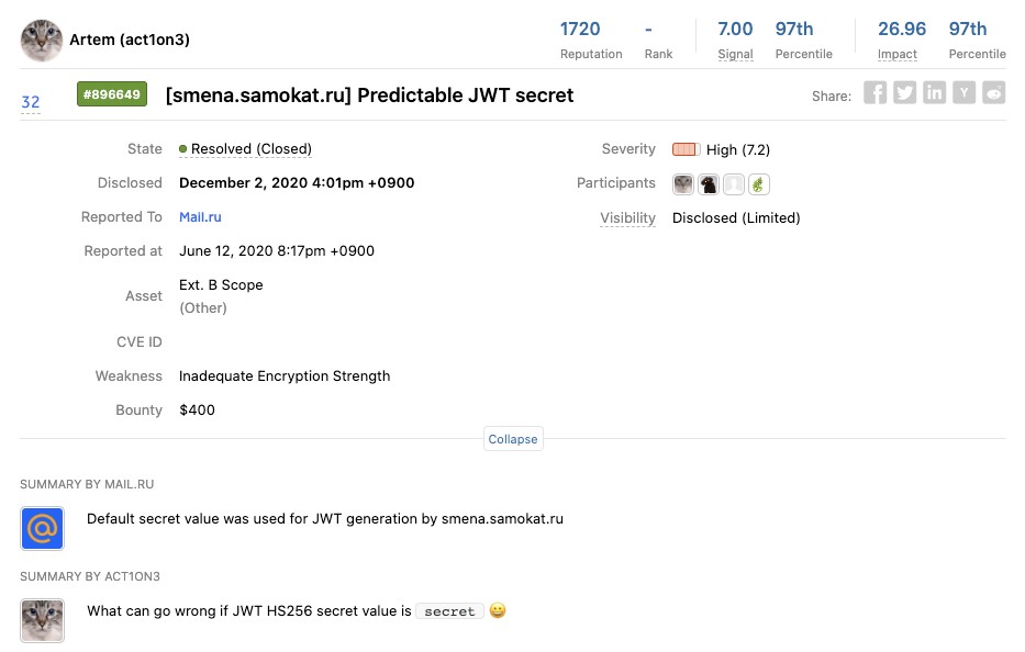 mail.ru JWT Crack (secret) 최근에 실제로 JWT Secret Key가 브루트포싱으로 크랙되어 바운티가 지급된 사례도 있으니, 바운티할 때 백그라운드에 돌려놓는 것도 괜찮을 것 같다.다시 생각해보니 무차별대입으로 브루트포싱 했다기 보다는 딕셔너리 방식으로 찾았을 가능성이 커보인다.