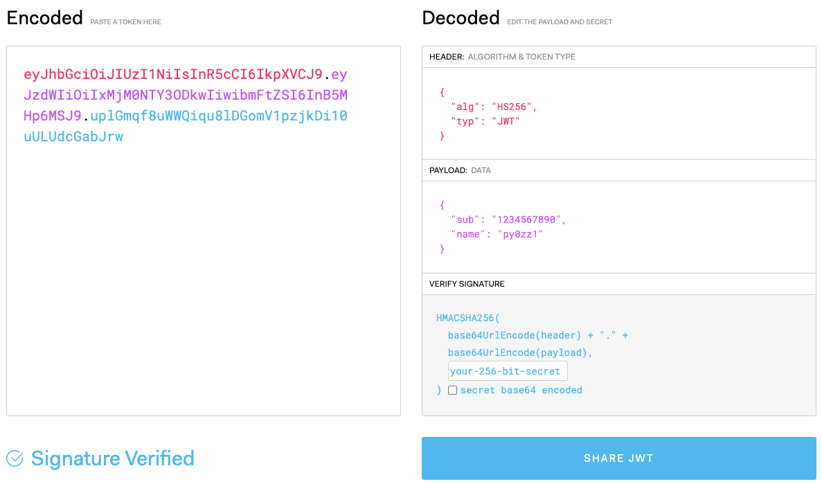 eyJhbGciOiJIUzI1NiIsInR5cCI6IkpXVCJ9.eyJzdWIiOiIxMjM0NTY3ODkwIiwibmFtZSI6InB5MHp6MSJ9.uplGmqf8uWWQiqu8lDGomV1pzjkDi10uULUdcGabJrw JWT토큰은 .(온점)을 기준으로 데이터가 구분되며, 위 값이 실제 JWT토큰의 모습이다.