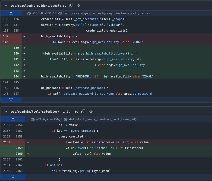 security@pgadmin.org, recommending that the business logic be implemented without relying on theeval()function.The pgAdmin team responded quickly — they reviewed the report and released a patch for the vulnerability in under 24 hours. :)