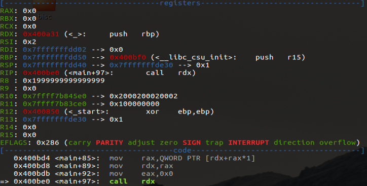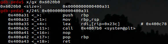 [그림 9] vtable size공간 참조 메뉴를 호출할 때 size공간에 저장된 0x400A31을 참조하게 되면서 oneshot( )가 호출된다.