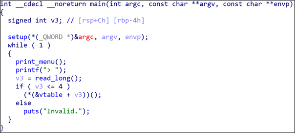 [그림 3] main( ) 특이사항은 메뉴를 호출할 때, 전역변수 vtable을 인덱싱하여 실행하고 있다.