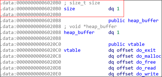 [그림 4] 전역변수 View vtable외에도 size와 heap_buffer가 전역변수로 관리되고 있다.