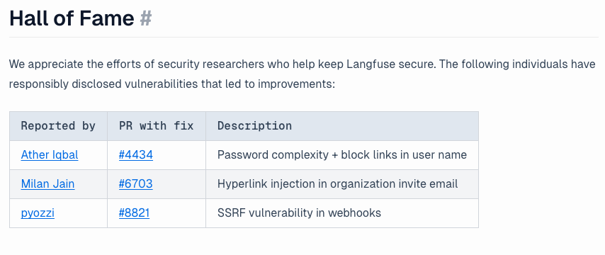 https://langfuse.com/security/responsible-disclosure#hall-of-fame 'Bug Bounty' 카테고리의 다른 글