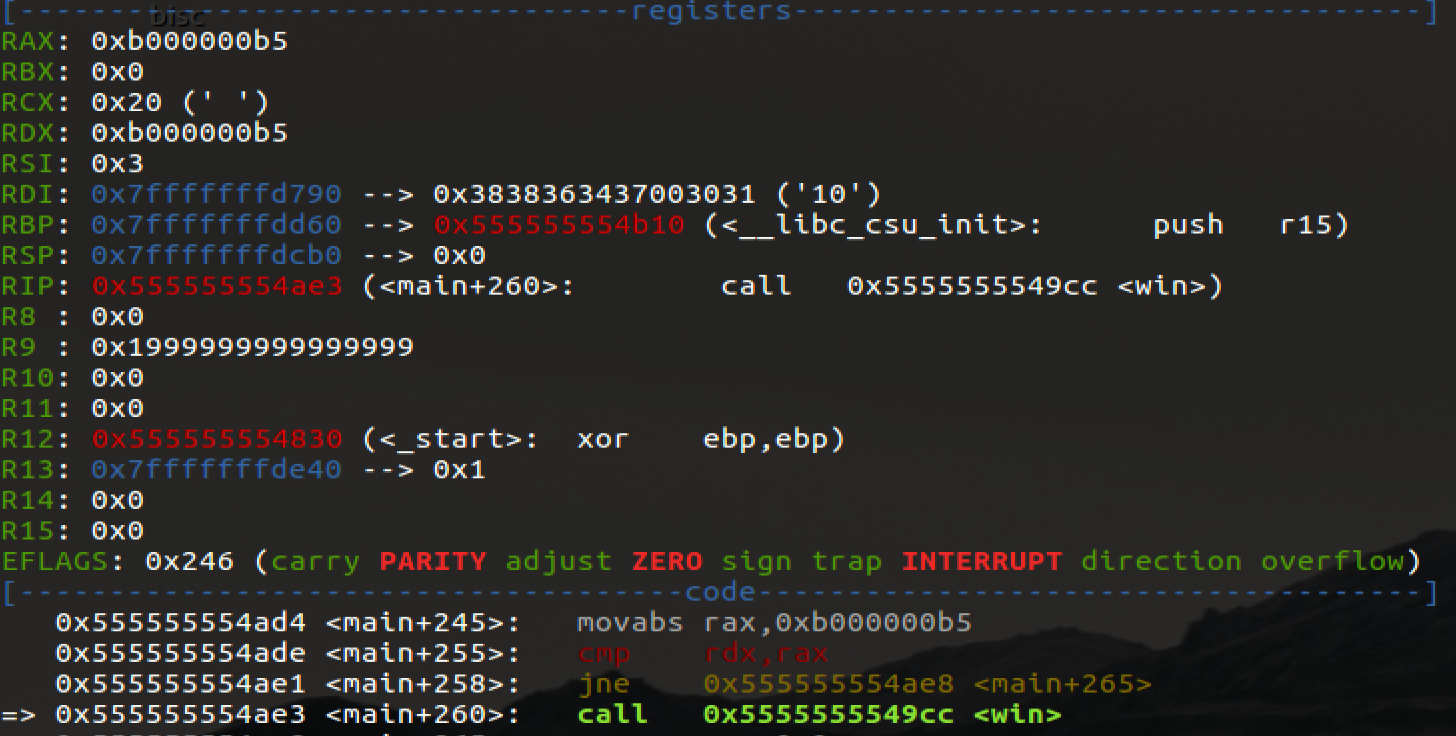 *(v5+7)의 저장된 값(RDX)과 0xB0000000B5(RAX)가 같기 때문에 if문 내부의 win( ) 호출코드로 이동한 모습이다.