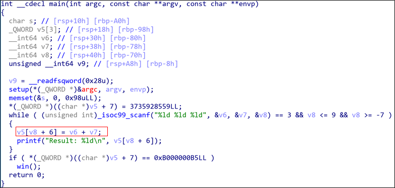 v6,v7,v8 모두 scanf( )를 통해서 입력받고 있으며, v8값으로 저장주소의 인덱스 참조를 조정할 수 있다.